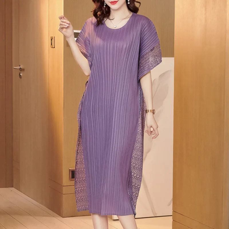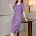 Best Dress Plus Size For Women 45-75kg Summer 2021 Round Neck Short Sleeve Stretch Miyake Pleated Loose A-Line Dresses Mid Calf and You will save 8% or US $67.24 today